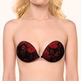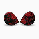 • A classic black bra with overlaid mesh and a red lace pattern.